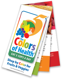 Fruits and veggies have the helpful habit of coming in a rainbow of colors. When you’re filling your shopping cart or basket, check that you have all 5 color groups covered: red, orange/yellow, white/tan, green, blue/purple. This way, you’ll bring home what you need to make healthy, colorful meals and snacks—foods that will help you reach the important goal of eating 5 cups of fruits and vegetables every day.